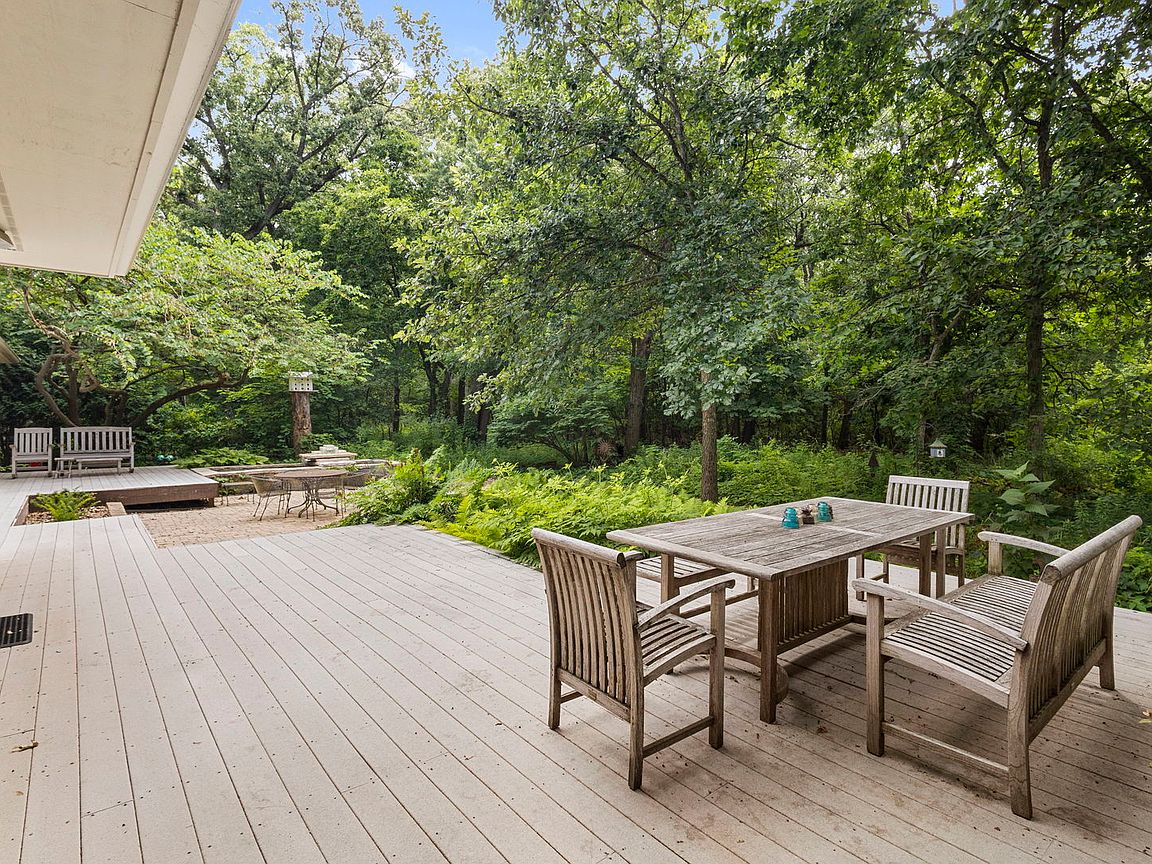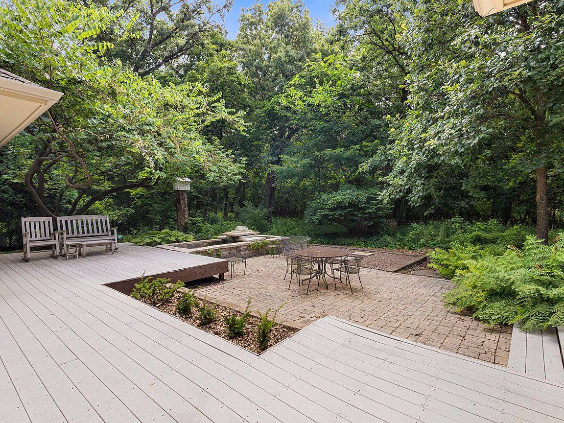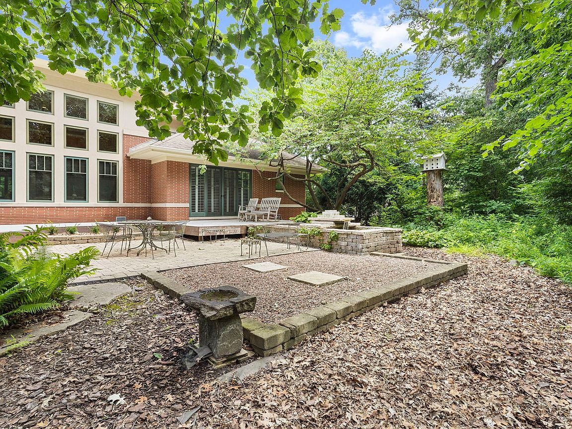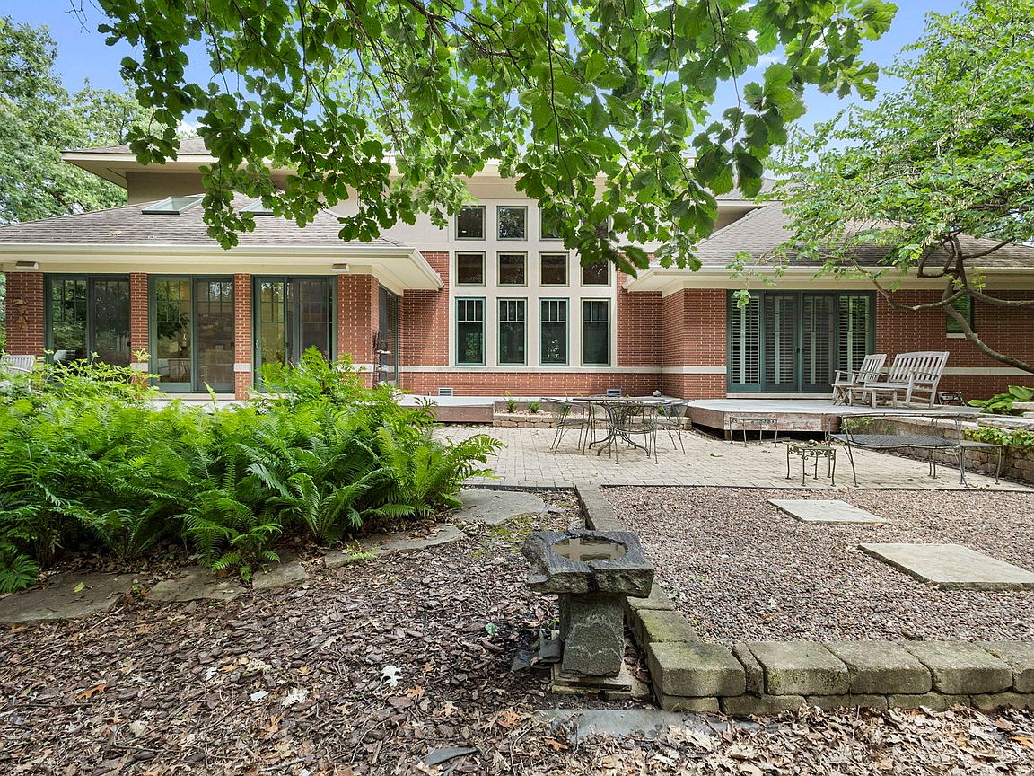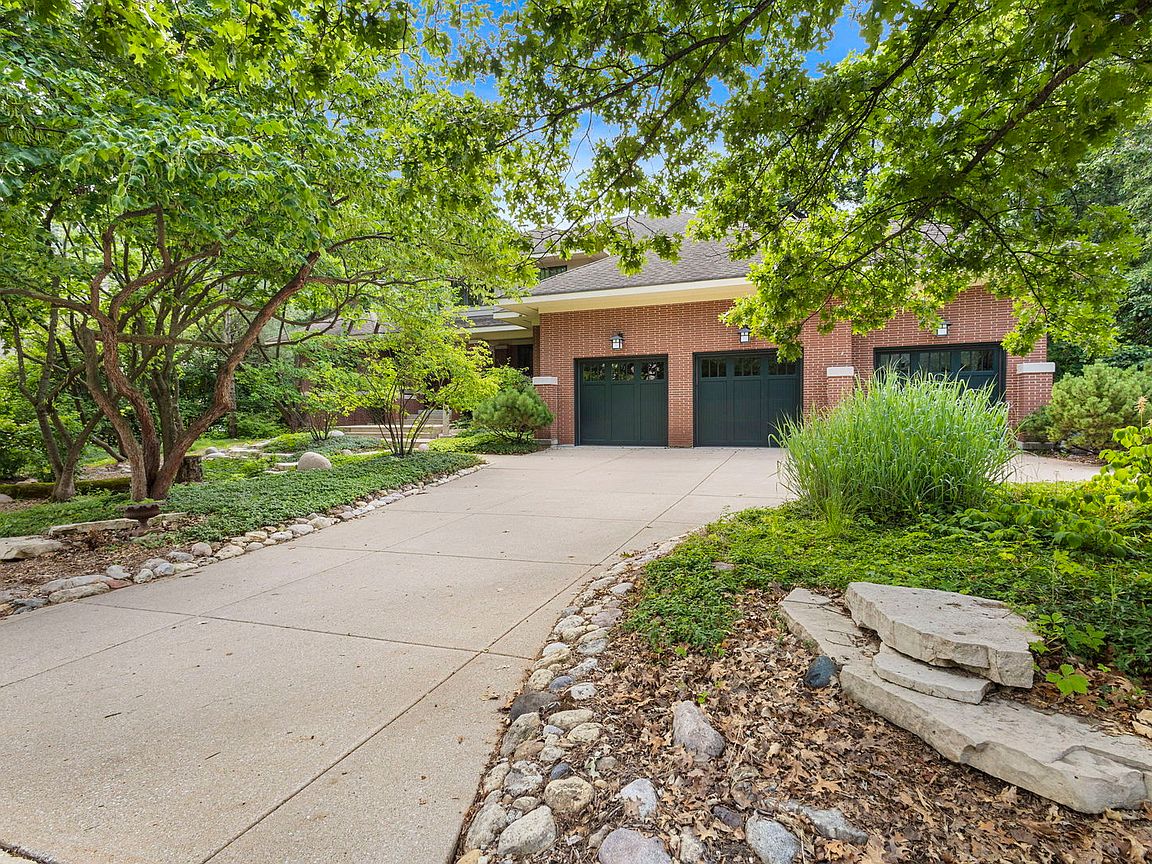 This stunning home is a showcase of Frank Lloyd Wright-inspired Prairie style, thoughtfully designed to harmonize with its natural surroundings. Situated on a quiet cul-de-sac, the home’s free-flowing layout was intentionally crafted for comfortable and connected family living.