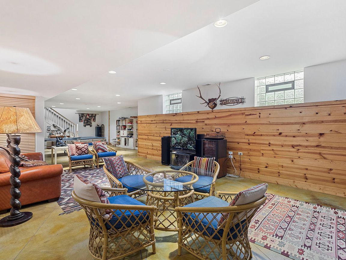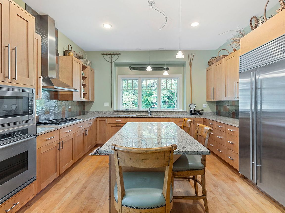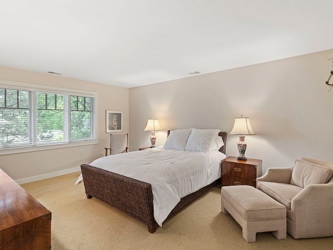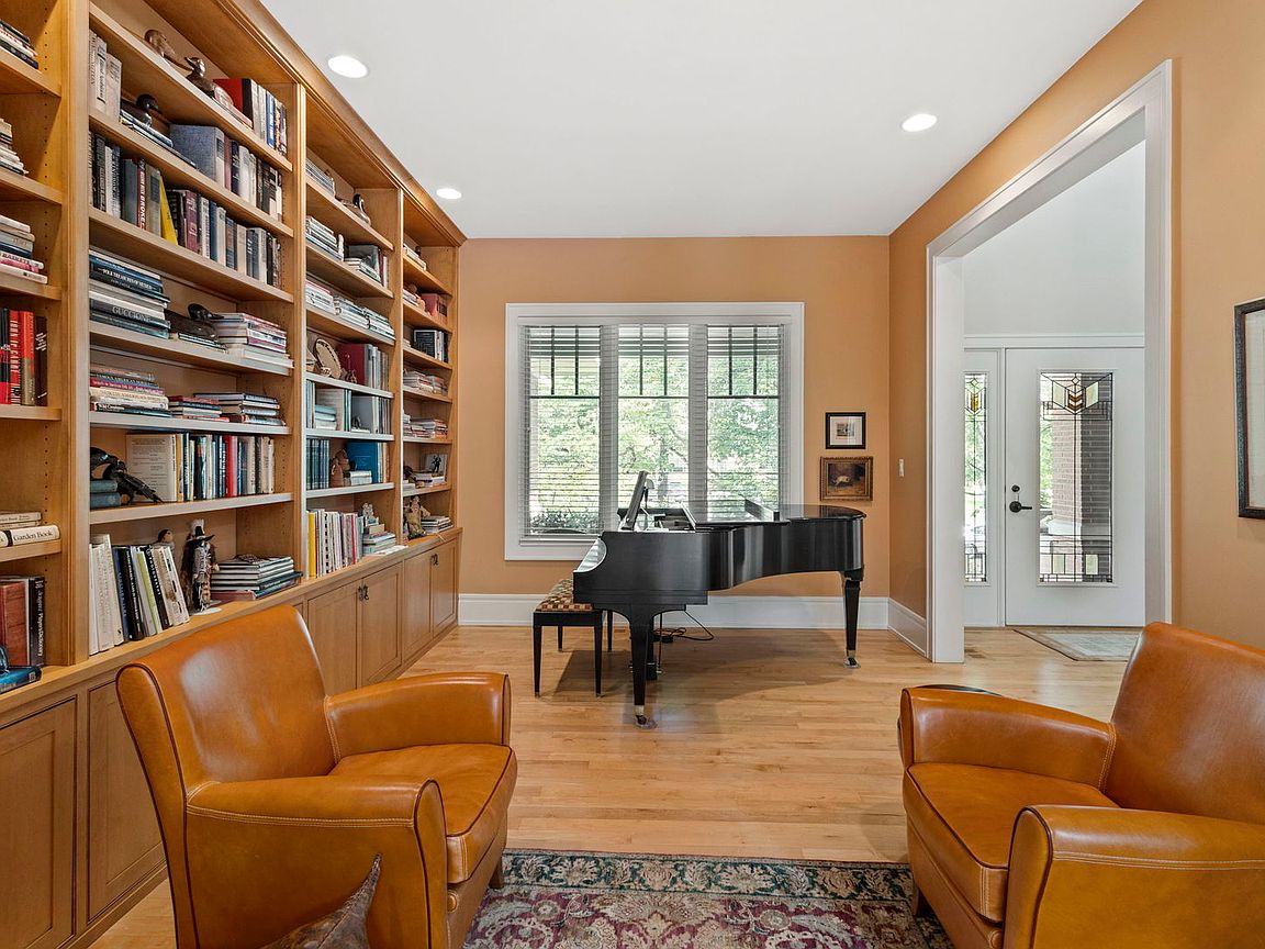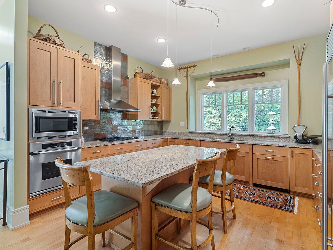 This stunning home is a showcase of Frank Lloyd Wright-inspired Prairie style, thoughtfully designed to harmonize with its natural surroundings. Situated on a quiet cul-de-sac, the home’s free-flowing layout was intentionally crafted for comfortable and connected family living.