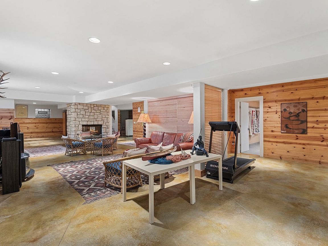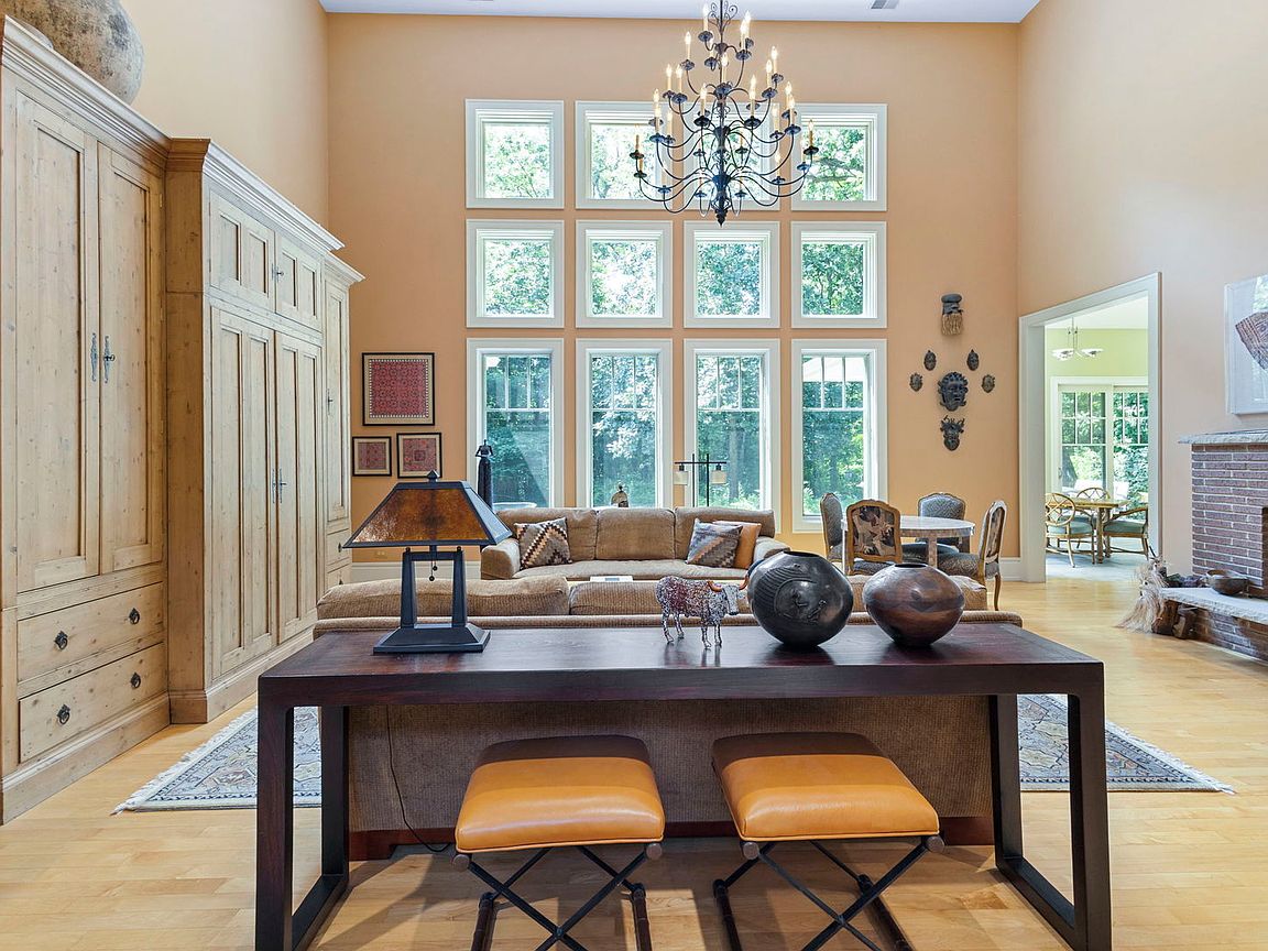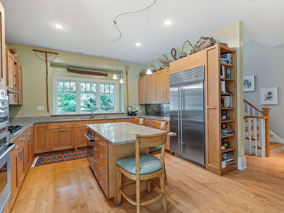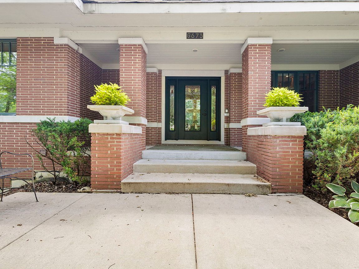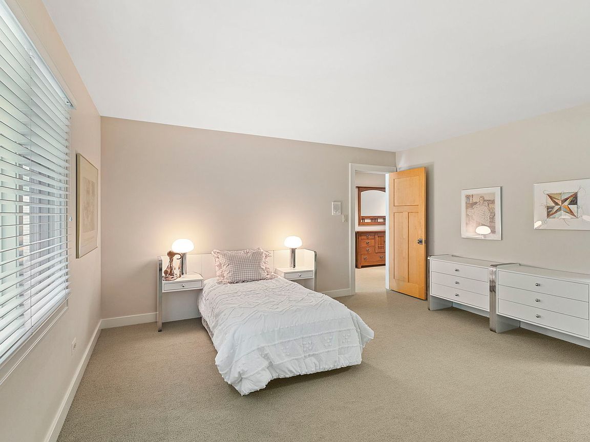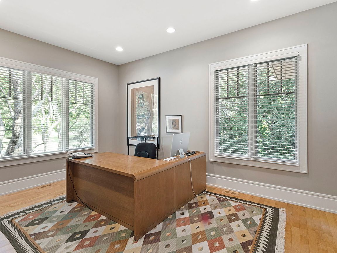 This stunning home is a showcase of Frank Lloyd Wright-inspired Prairie style, thoughtfully designed to harmonize with its natural surroundings. Situated on a quiet cul-de-sac, the home’s free-flowing layout was intentionally crafted for comfortable and connected family living.