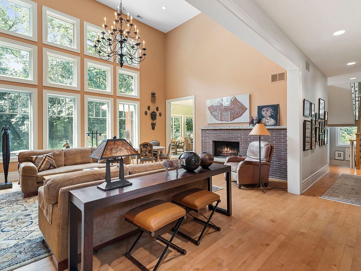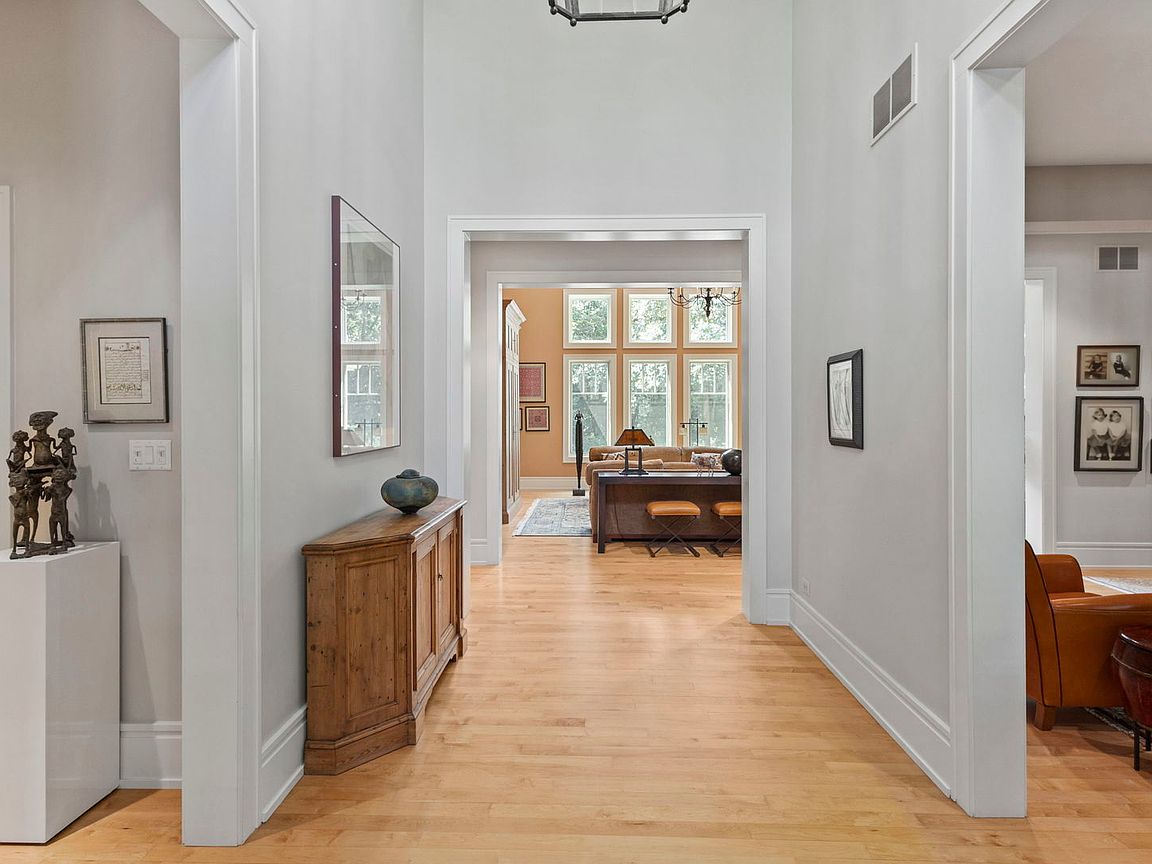A striking stained glass front door welcomes you inside, where the architecture immediately captivates, drawing you inward and upward. The main level features beautiful hardwood floors, soaring 10-foot ceilings, and a functional floor plan designed for modern living. Highlights include a dedicated first-floor office, a cozy library, a spacious primary suite with an elegant bath, a well-appointed kitchen with an adjoining eating area, and a spectacular great room with 19-foot ceilings and a dramatic wall of windows that frame views of the lush backyard – seamlessly blending structure and landscape.